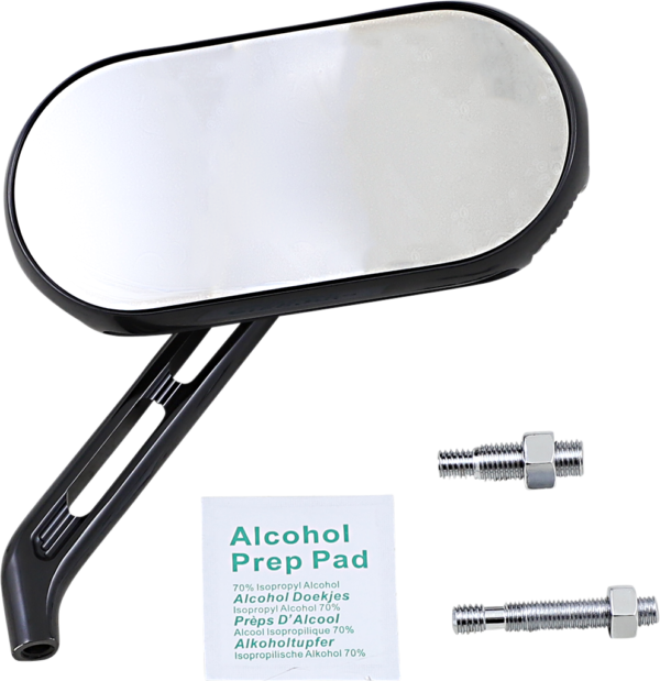 Oval shaped mirror inspired from the angled Sidekick Air Cleaner, Mirror head and stem forged from billet aluminum, Heavy duty stainless steel internal pivot hardware, Standard and metric mounting hardware included, CNC machined detail seen from all angles, Laser engraved Arlen Ness logo