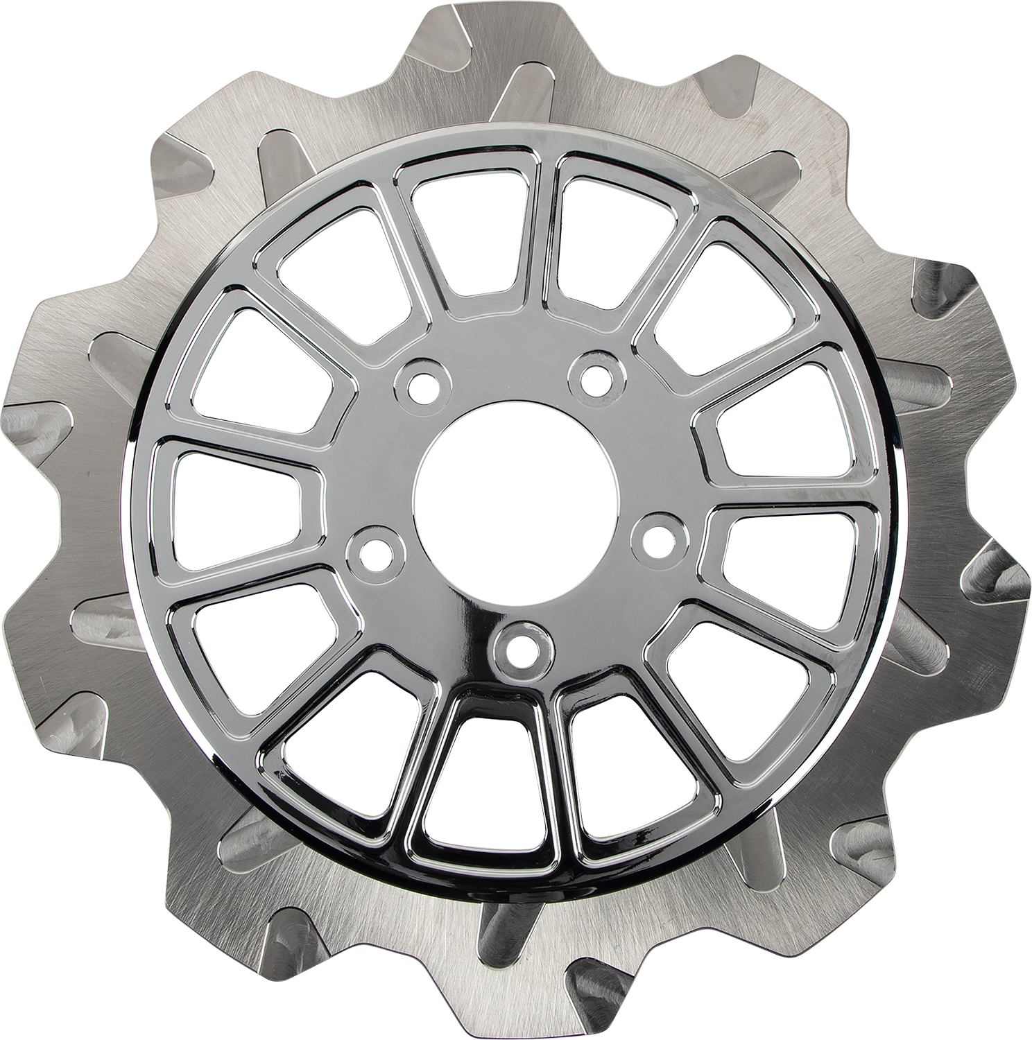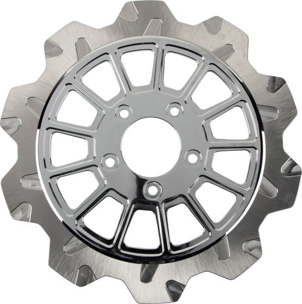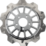 Machine finish friction ring with a chrome center carrier, Full floating performance rotor, bolt on replacement for Harley-Davidson, Slotted rotor grooves improve performance under heavy braking by lowering brake fade from high-temperature brake pad outgassing, by allowing gases to escape through the slots, improving braking consistency, Made in the U.S.A.