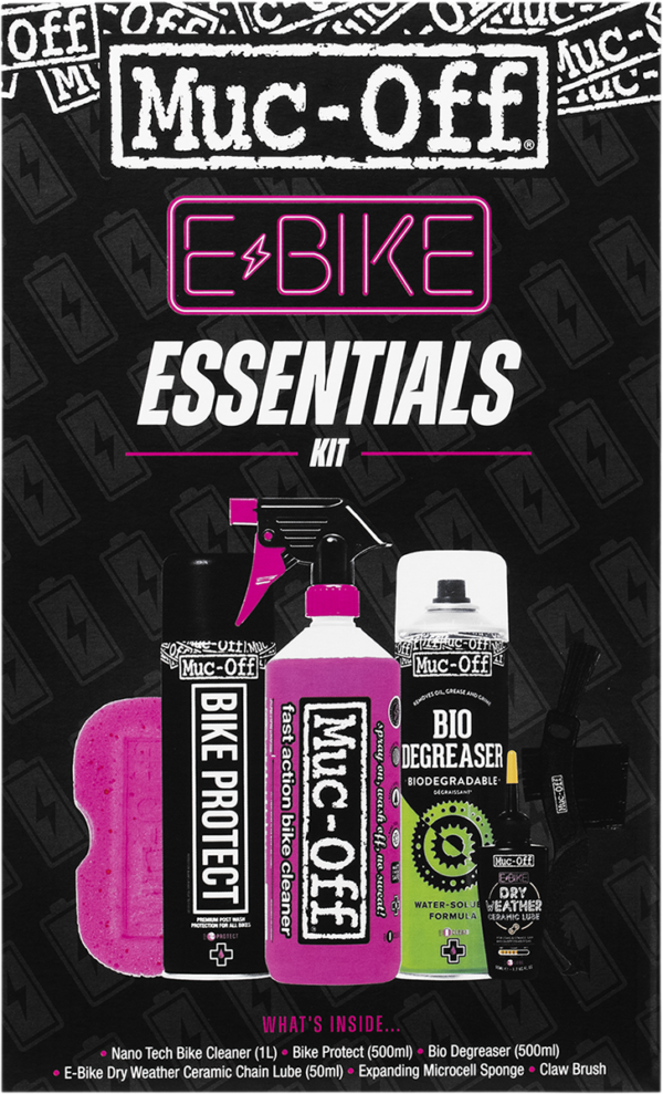 Includes essentials for lubrication and cleaning, including the following:, Nano Tech Bike Cleaner – Safe on all parts and surfaces including carbon fiber / Will not harm seals, cables, brake pads or rotors / Safe on anodized metal / Alkaline based and free from CFCs, solvents or acids / Nano Tech Formula cleans on a molecular level / Biodegradable / 1 Liter, Bike Protect – High performance formula leaves dry, non-sticky protective film / Safe on frame, metal parts, plastics, rubber, paint and carbon fiber / Drives out excess moisture / Prevents dirt adhesion / Light lubricant coats moving parts / Quick and easy to use / 500 ml aerosol spray, eBike Dry-Weather Lube – Creates a dry ceramic coating for increased durability and dry condition performance / Contains Boron Nitride compounds / Ceramic compounds provide ultra-low friction for unparalleled lubrication / Non-dust attracting – excels in dry and dusty conditions / Utilizes biodegradable organic compounds / Ideal for road and off-road / Integral UV tracer dye aids accurate application to ensure total protection / 50 ml, Bio Degreaser – Bio Formula easily cuts through tough grease / Can be used on chains, gears, mechs and individual components / Water Soluble formula for easy cleaning / Works on the tough waterproof grease and chain wax / 500 ml, Claw Brush – Ideal for chains, cassettes, mechs and sprockets / Scraper for mud de-clogging / Durable ultra-stiff nylon brushes ensure even the toughest of grime can be cleared / Features 3 brush heads, Expanding Microcell Sponge – Compact / Ergonomic shape for maximum comfort and ease of use / Vacuum packed