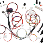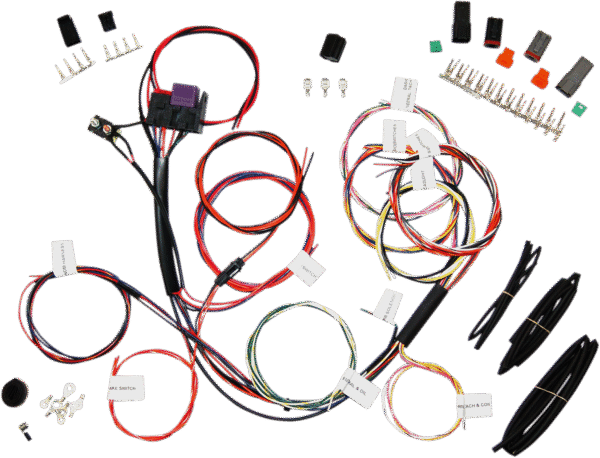 Fuse block holds a full size, commonly available & replaceable starter relay and (3) ATO fuses, A 30-Amp circuit breaker is installed and is ready for any regulator/charging system, Oil, neutral, high beam, and turn signal indicator wiring, Color matching handlebar switch wiring as found on ’96-’13 non-glide models for HI/LOW, HORN, START & KILL switches only, Headlight wiring with headlight socket and terminals, Rear fender taillight harness with connectors and terminals, Sections of 3/16″, 1/4″, 3/8″ and 1/2″ ID heat shrink included