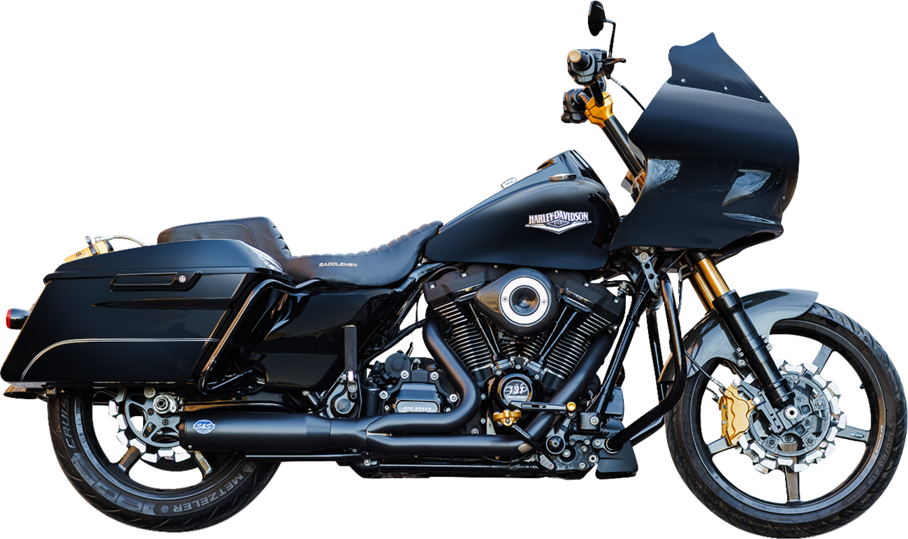 Inspired by the King of the Baggers race bike exhaust system, Full heat shields on front and rear header pipes, S&S race inspired muffler end cap, Made in the U.S.A., For closed course competition use only, not intended for street use.