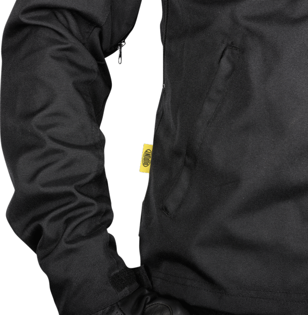 600 D high abrasion resistant polyester , High abrasion resistant mesh liner, DuPont Kevlarâ„¢ lining on impact areas such as the arms, back, and shoulders, Comes with interior back, elbow, & impact protection pads (removable), Hook and loop wrist closure seals out wind, Lower exterior pockets with YKK zippers, Double shoulder design and pre-curved sleeves for comfort in riding position, Elastic thumb loop keeps sleeves from riding up at high speeds, Embossed button snap wind cover with double pull YKK zipper, YKK zippers in underarm area for ventilation, Waist fitting buttons, No flap collar
