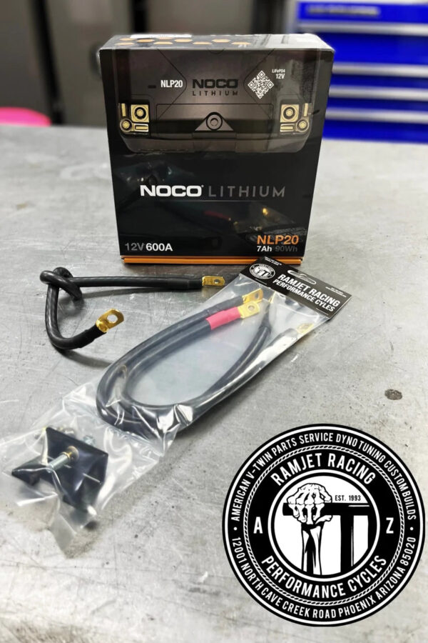 FXR BATTERY HOLD DOWN WITH TERRY COMPONENTS CABLESWhen putting a NOCO NLP20 lithium battery or a 20L battery (OEM #65989-97E, factory in 97′-present day Dynas and Softails) in your FXR you will notice the positive and negative terminals are flipped compared to your old battery. With this kit we offer longer and more flexible cables to adjust for the flipped terminals, making install easier. The benefit of running a late model 20L battery is that it can be found much easier than the factory battery!TERRYS CABLES FACTS: